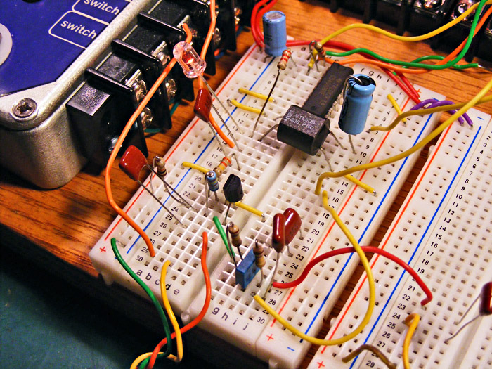 Here you can see the LFO hooked up to the vactrol, then to where the VR1 pot was on the original schematic. For fun I added three different capacitors on a Peak switch and then on to a 100K linear pot to add a bit more control.