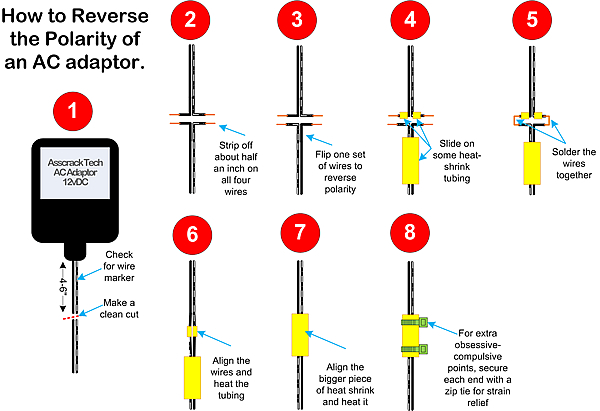 Solution: Take your wire cutters and snip the cord about four inches from the base of the AC adaptor. Strip all four wires (two on each one). Twist them together, solder them, and wrap the whole thing up in electrical tape. For a better (and longer lasting) job, use heat-shrink tubing on each wire and then more on the finished job.