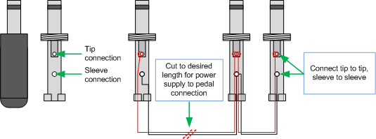 Once you have calculated all the current draw figures and determined the permutations of multiple pedals to be powered from one port, it's time to get some daisy chain cables. You can buy them, but that will make you less cool, so why not build your own. Get some zip wire and 2.11mm DC connectors and follow the diagram below: