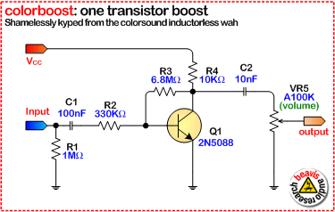 The old Colorsound Inductor-less wah circuit is a fun and easy project. You don't need an inductor and it lends itself to all sorts of fun variations. First let's look at the stock schematic.
