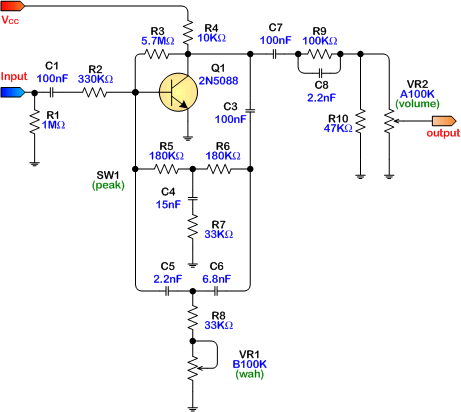 What we have here is a simple single-transistor amplifier connected as a twin-t filter. The pot at the bottom provides the "wah" function. So the first thing you can do is simply build the circuit with the VR1 control as a pot with a knob on it and you have a cocked-wah pedal: set any wah position manual and you're good to go.