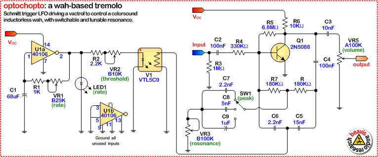 But what if you replace the VR1 pot with a low frequency oscillator (LFO)? Now you have a tremolo that uses the wah position to set the volume up and down. This is an interesting take on the usual tremolo function which typically just shunts the signal to ground or changes the amplification factor up and down using an LFO. So how do we go about replacing a pot with an LFO?