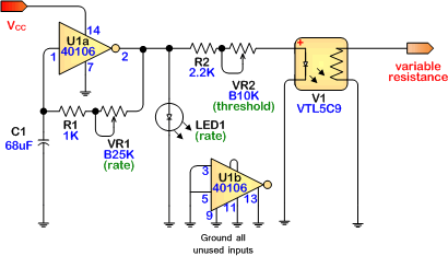 So know we have a voltage pulse whose time we control. The next question is how to convert a voltage into resistance. After all, we are trying to replace the VR1 wah pot which is a variable resistor. The answer is in the form of a Vactrol--a device that uses an LED and a photo resistor encapsulated in a way the keeps outside light out. After much experience, I settled on the VTL5C9 as it provide a good balance between time and resistance. I also added another pot, VR2, so I could control the intensity of the signal sent to the vactrol.