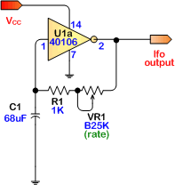 Pretty simple: I use just one gate of a 40106 Quad Schmitt Trigger. The combination of C1 and VR1 set the range of speed. R1 is a limiter resistor so the LFO doesn't get to fast. At the output there is a simple on/off voltage pulse in the form of (roughly) a square wave.