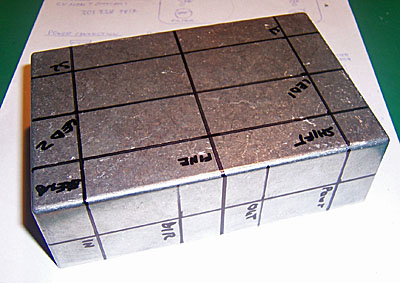 Next, it was on to the box: I measured the enclosure and drew template lines according to Mr. Nitefly's instructions. The idea was to have the three knobs equidistant across the top, the to LEDs in the middle, and then the two stomp-switches. Here's what the box looked like after marking: