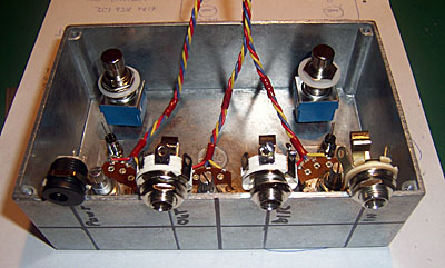 The Frequency Analyzer has a Filter slide-switch on the back panel. Why not make that a stomp-switch also and add another LED? So I incorporated that into the design as well. Finally, I did a bit of research on the Frequency Analyzer and stumbled across a most excellent modding site: E xperimentalists Anonymous. Colin, how runs the place has an awesome CV mod where you can splice in a jack and use an external source for the CV signal. His ingenious solution incorporates a stereo 1/4" jack, so when nothing is plugged in, the circuit's built in CV generator is used.