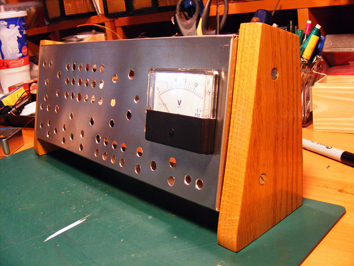 As with the Armageddon Processor, this is not going to be a pedal, but a table-top unit. So using my wood sides template, I cut out, sanded, stained and poly'd a couple of pieces of nice red oak. A few bolts on the sides and it is now fully upright.