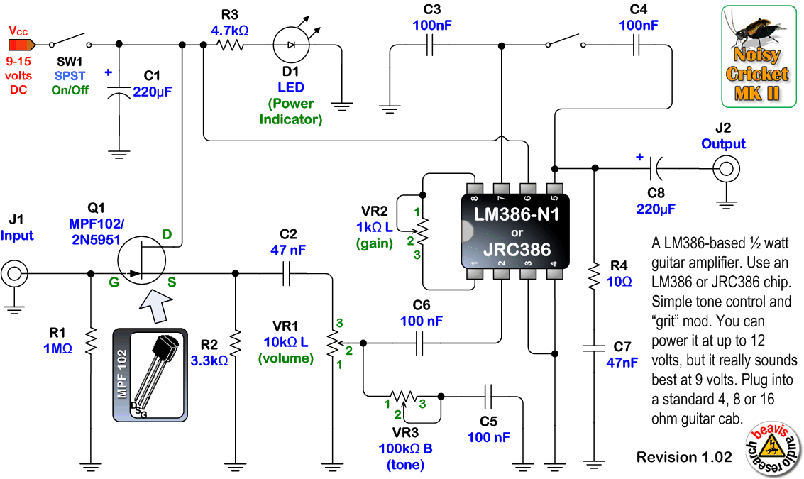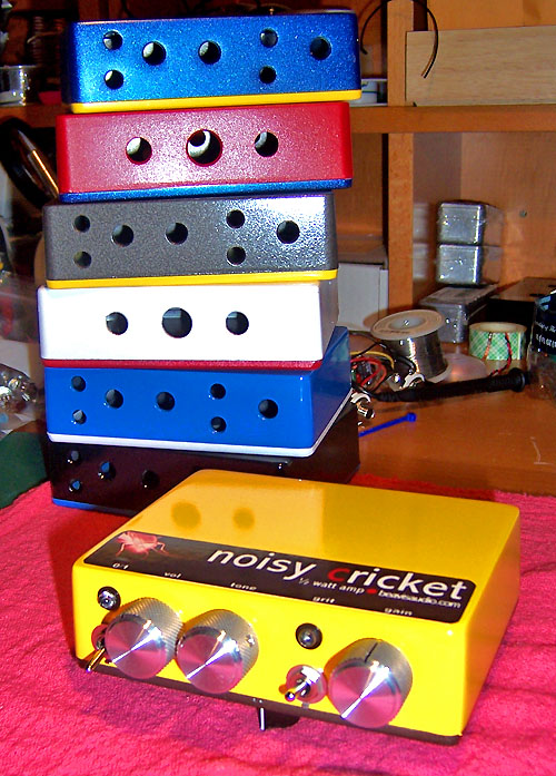 After a many evenings of experimenting, I ended up with the Noisy Cricket Mark 1. Built into a simple Hammond enclosure, the Noisy Cricket added a simple tone control, and grit mod for getting just a bit more sizzle. I built quite a few Noisy Crickets for folks who wanted one. But I met even more people who wanted to build their own. So several DIY versions have been available.