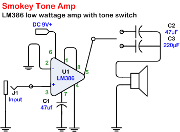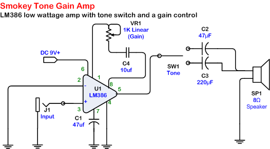 This great chip has spawned the commercial Smokey amp, and various great practice amp projects from runoffgroove.com such as the Ruby and the Little Gem. (More about my Ruby builds here). Years ago, I built a Ruby using a PCB from GeneralGuitarGadgets. It was quite easy to build and I was amazed that a 9v battery into a 386 chip could easily power a 4x12 guitar cab. But as always, there were mods to be tried.